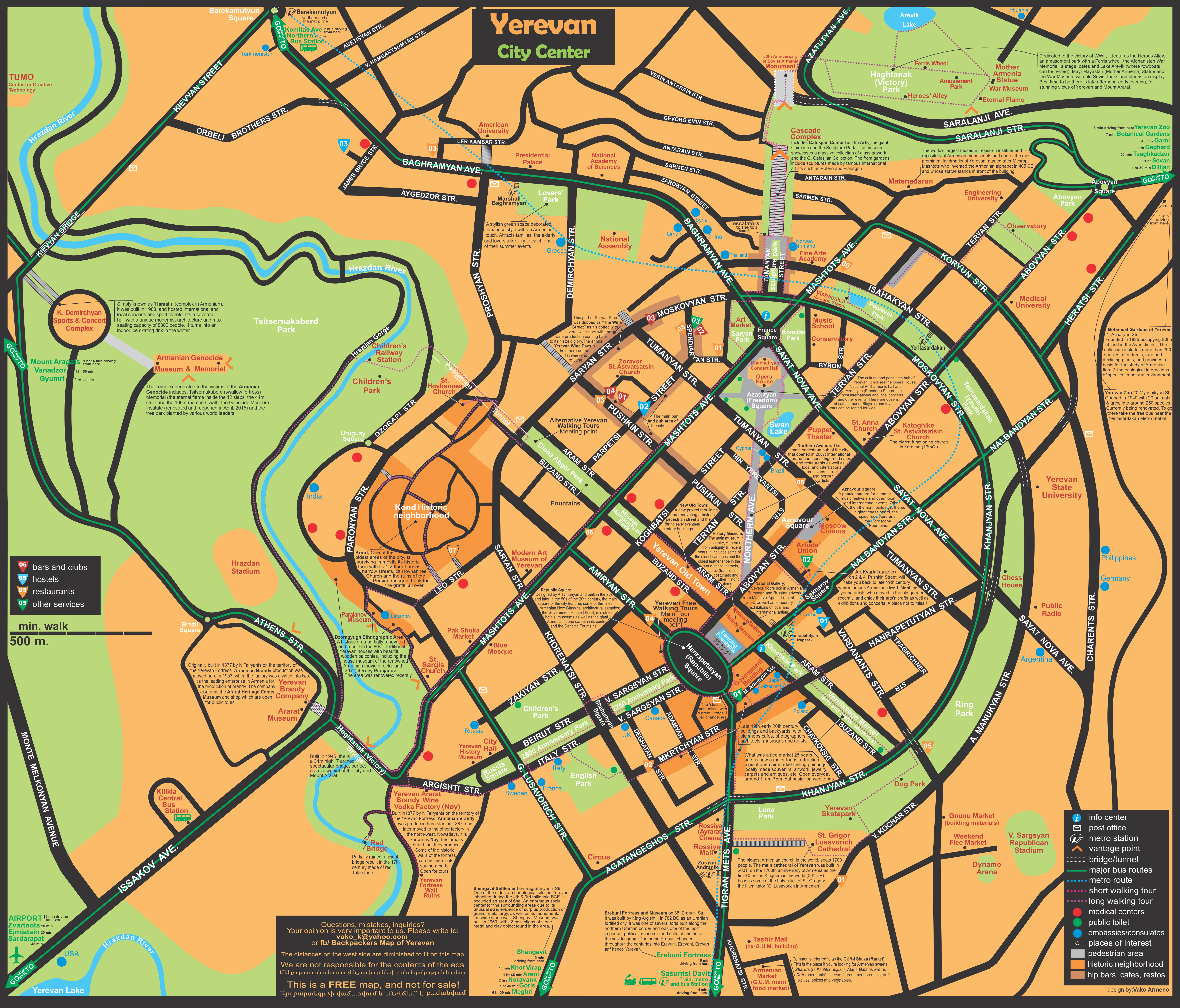 This is our annually printed guide map since 2014. We give the printed version to our travelers. It gives you a lot of insight about things to do in Armenia and specially in Yerevan. It contains details about a few hostels, bars, restaurants, outdoor activities, tours and other services too.